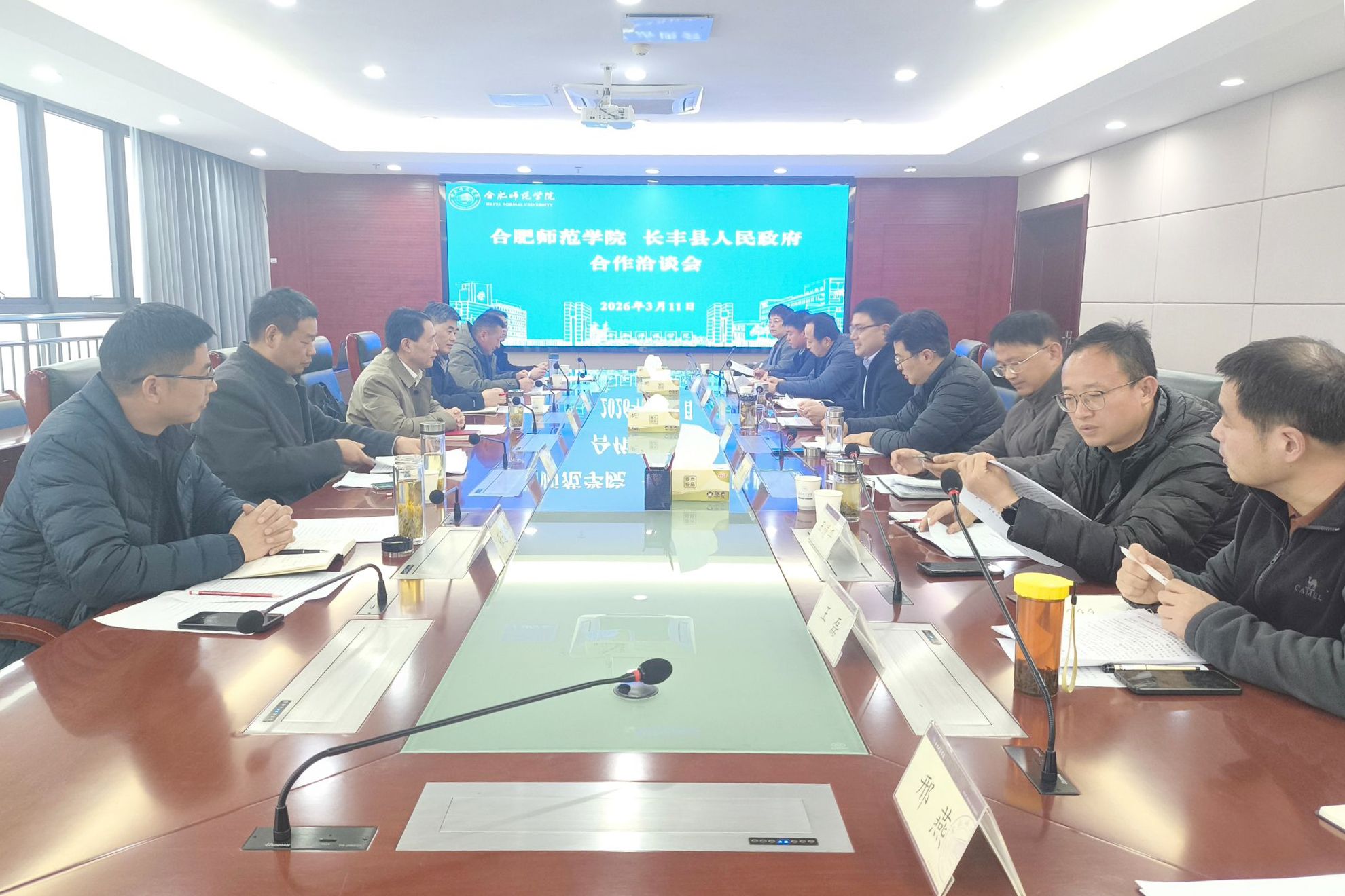 3月11日下午,长丰县教育体育局党委书记、局长杨维成一行来校,就县校协同发展进行专题洽谈。党委委员、副校长周端明,发展规划处(服务地方办)、三中心、就业创业工作处、教务处、科研处、研究生院、继续教育学院等单位负责人及教师代表参加会议。会议由周端明主持。