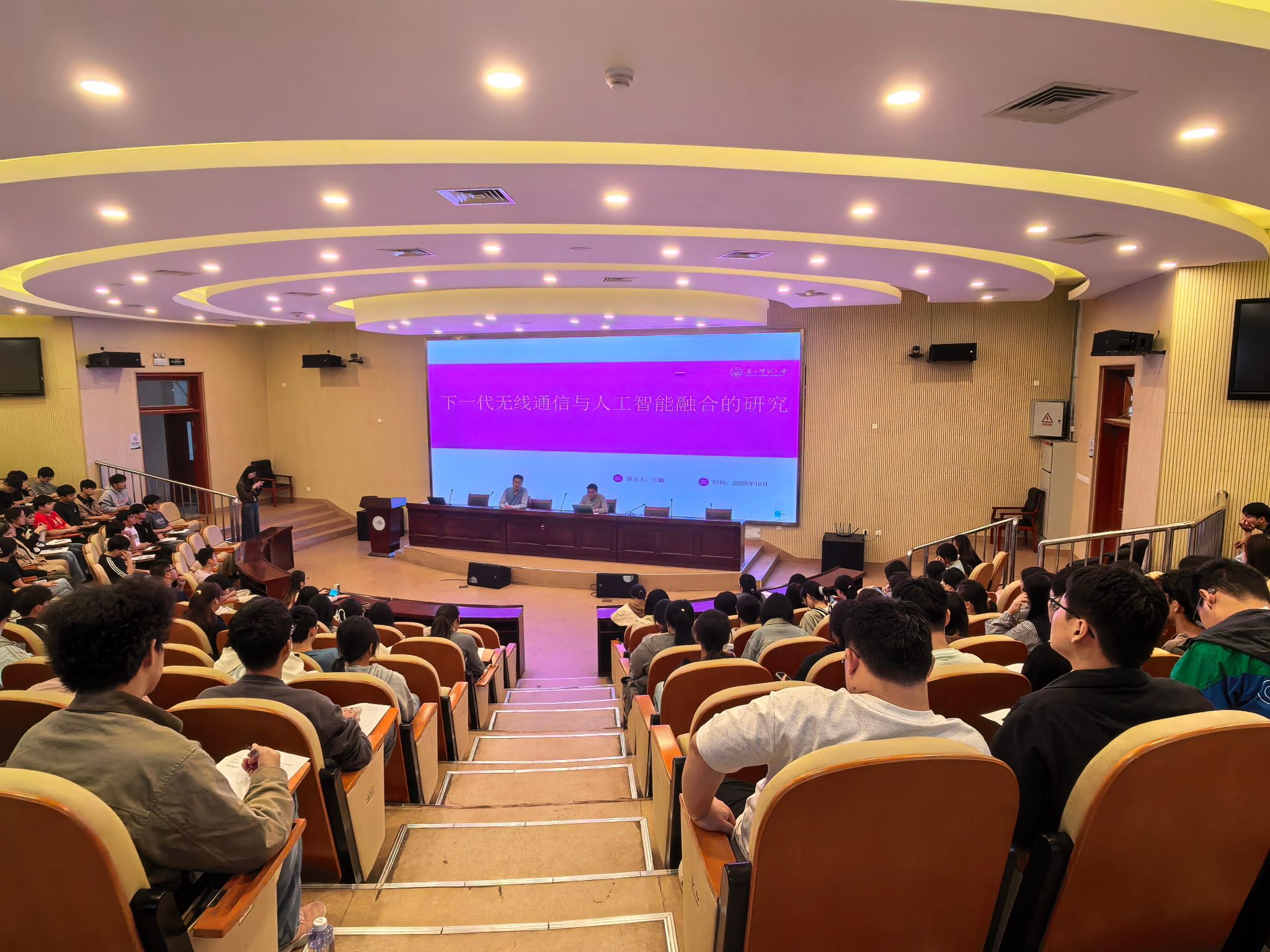 在滨湖校区,王勋校友以《6G 无线通信和 AI 研究》为题在滨湖校区报告厅开展专题讲座。他以“原理科普-技术演进-案例分析”-的逻辑框架,解读了智能通信网络的核心架构,阐释 AI 赋能通信技术的创新应用。他鼓励学弟学妹“既要扎根专业课本,更要追踪学科的前沿动态”。