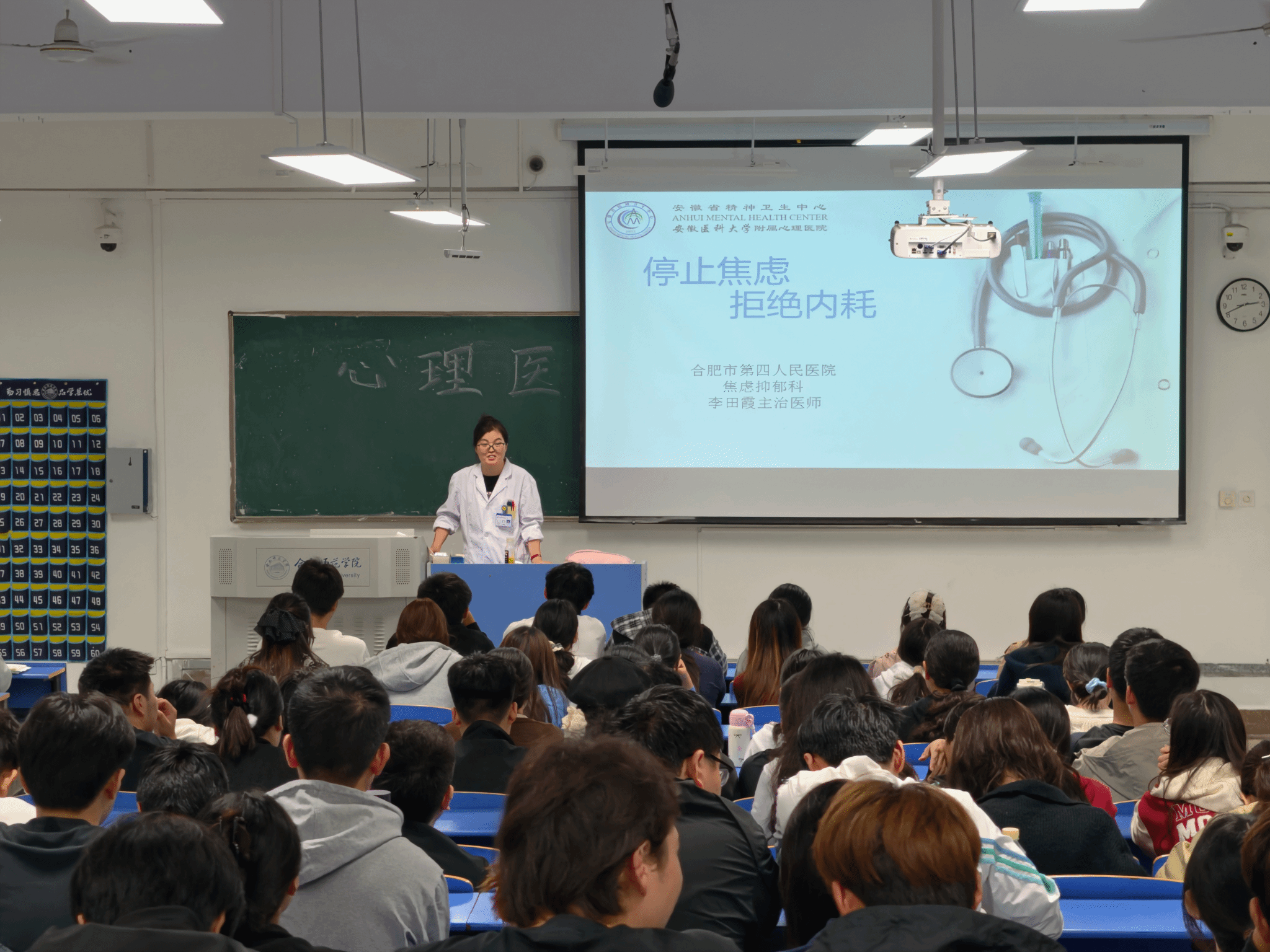 作为宣传周核心,“心理医生进校园”主题活动邀请精神卫生专科医生开展科普讲座。安徽精神卫生中心焦虑抑郁科主治医师李田霞以“停止焦虑 拒绝内耗”为主题结合临床案例解析焦虑情绪的生理机制与心理表现,厘清正常焦虑与焦虑障碍的边界,明确精神内耗的危害,系统传授“认知重构三步法”“正念认知疗法” 等实用干预技巧,并通过现场互动答疑破解学生“越控制越焦虑”的认知误区。安徽医科大学附属巢湖医院精神科副主任医师宋苏琪则聚焦大学生群体痛点,以《内卷、精神消耗、emo、摆烂、躺平》为题,用数据还原当代大学生心理压力图谱,从社会环境与个体认知双维度剖析负面情绪产生根源,并结合生动案例,分析了这些现象背后的心理机制,提供了实用应对策略,引导学生建立健康的应对机制。讲座现场互动热烈,学生们纷纷表示受益匪浅。
