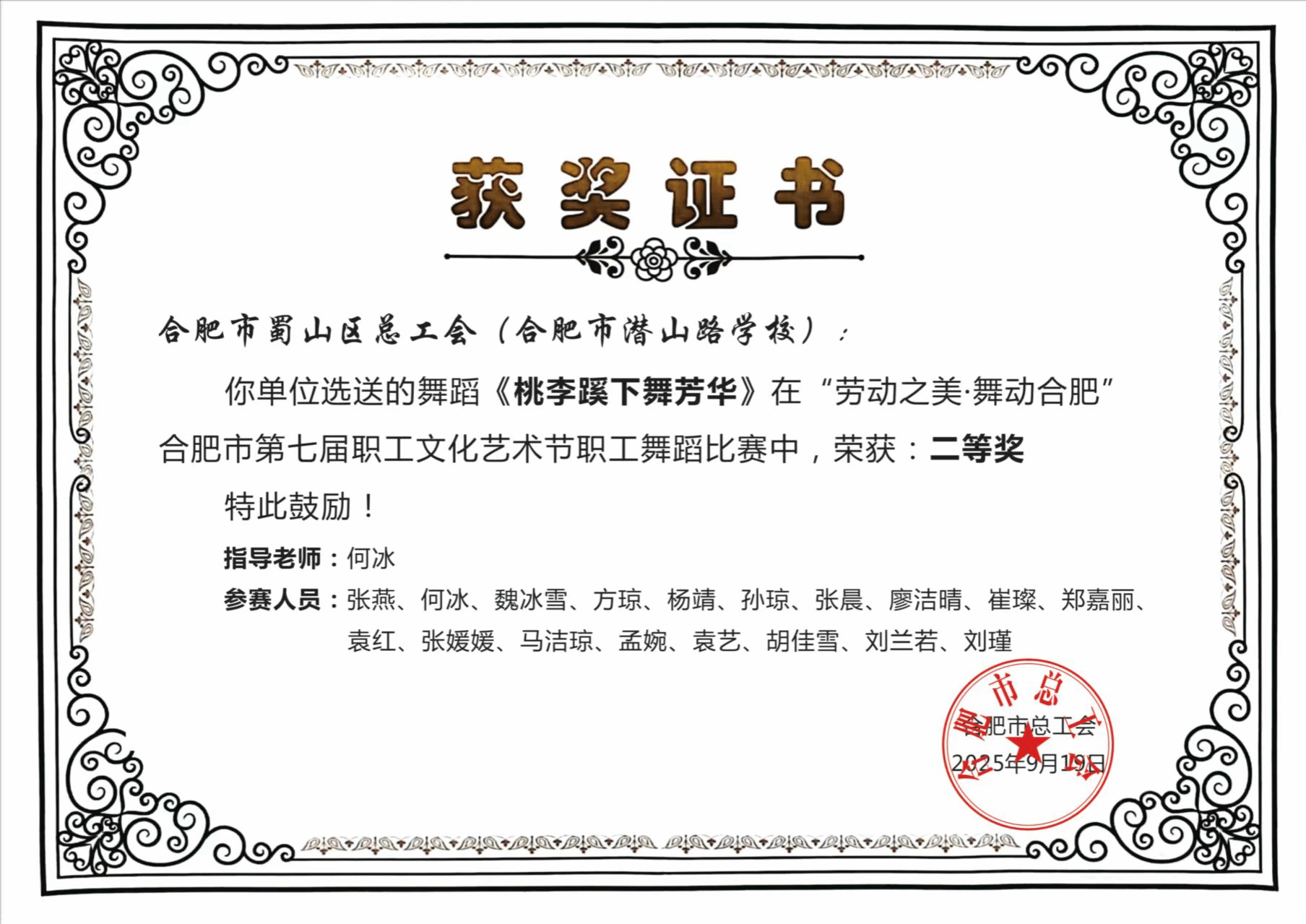 近日,合肥市第七届职工文化艺术节“劳动之美,舞动合肥”职工舞蹈比赛圆满落幕。合肥师范学院音乐学院教师何冰在合肥市潜山路学校挂职副校长期间,带领该校教师团队编排的舞蹈《桃李蹊下舞芳华》凭借精湛的艺术呈现与深刻的内涵表达,从众多参赛作品中脱颖而出,最终斩获比赛二等奖。
