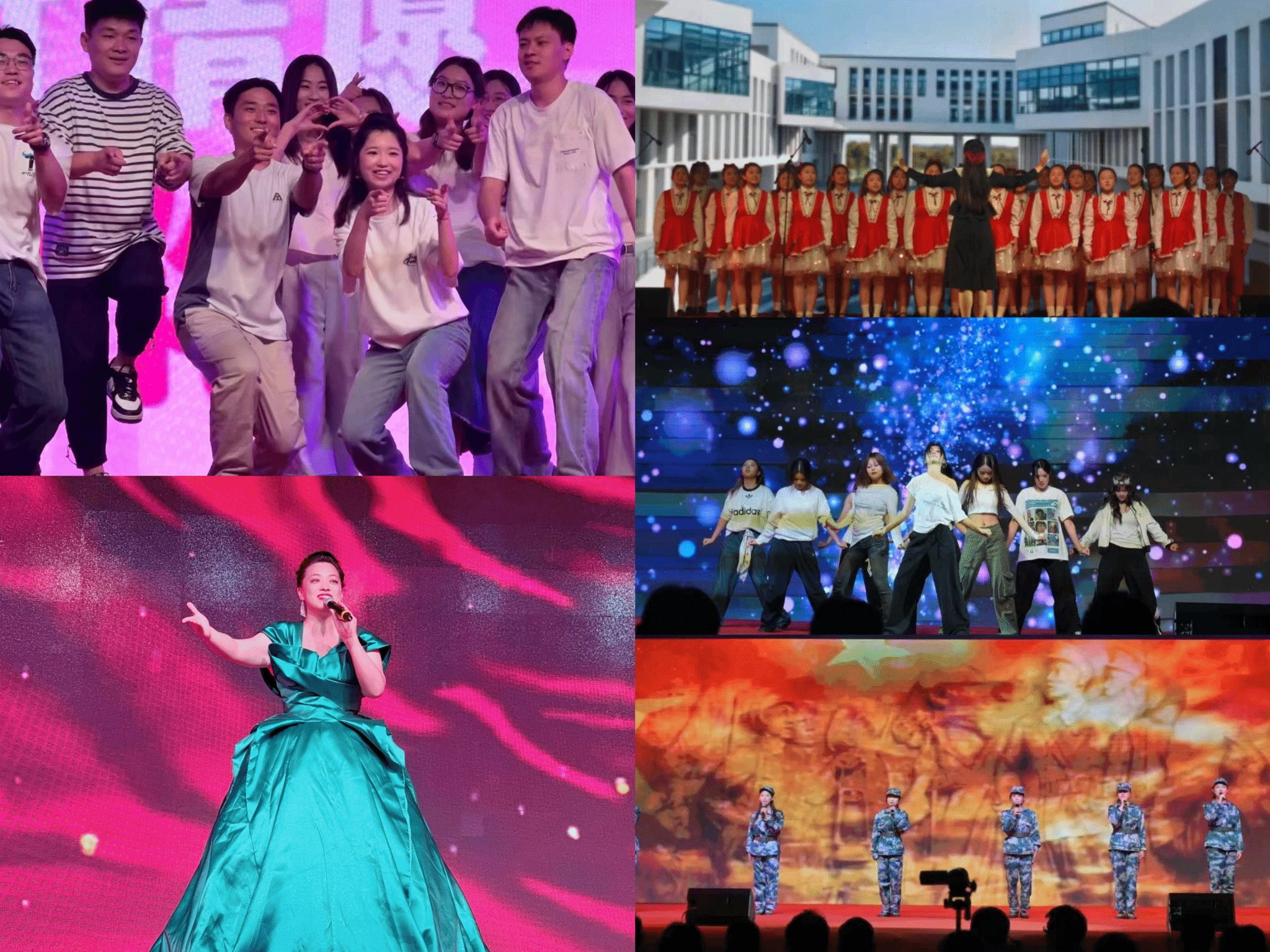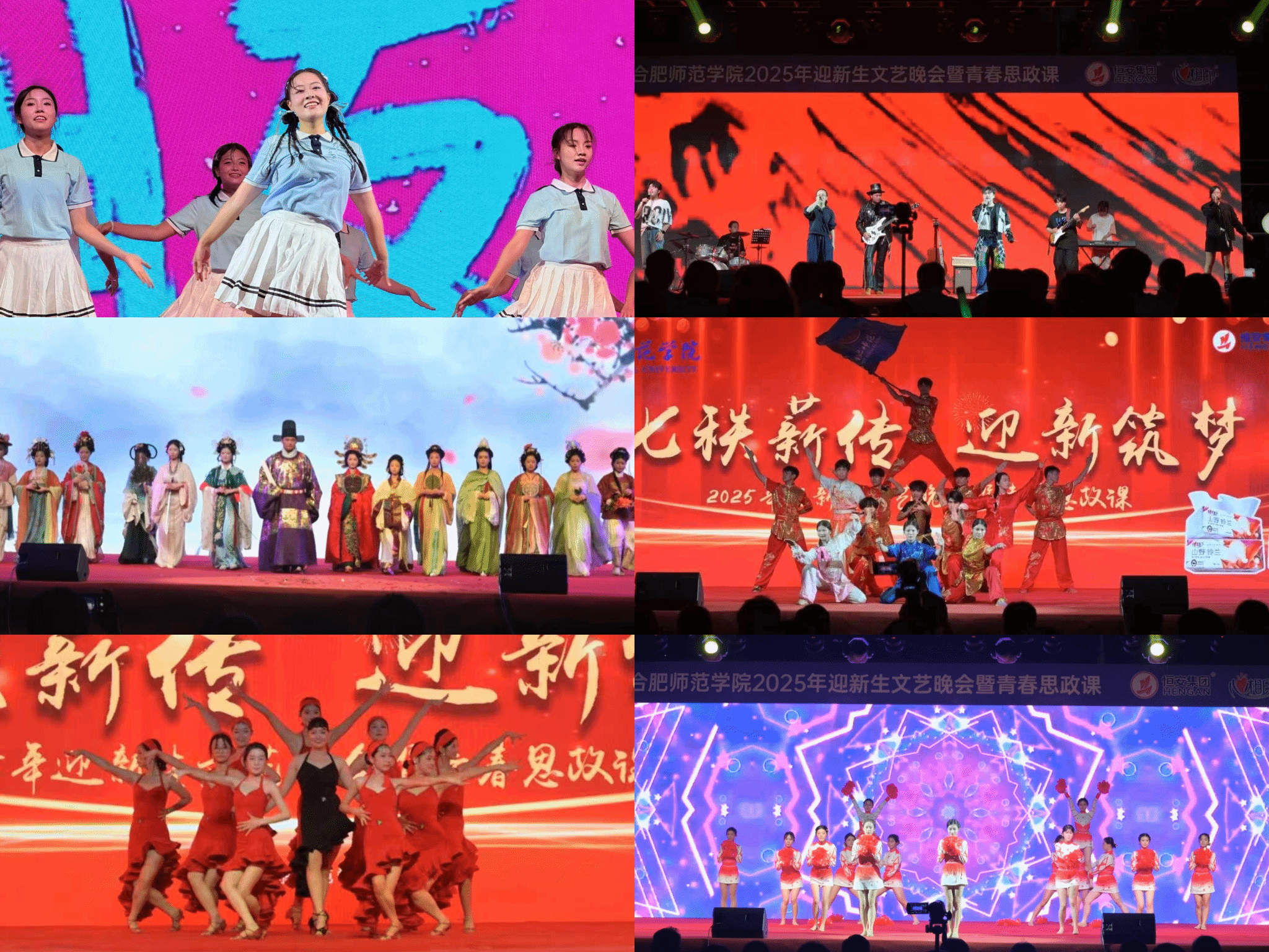 弦舞吉他社带来的歌曲《新长征路上的摇滚》《蓝莲花》拉开了晚会帷幕,动人的旋律点燃了全场。啦啦操《燃动青春》以昂扬的姿态诠释出新时代青年的激情与担当,展现了合师学子朝气蓬勃、奋发向上的精神风貌。武术《藏龙卧虎》刚柔并济,一招一式尽显中华儿女的英姿飒爽。由2025级新生代表带来的朗诵《山河不会忘记》以青春之声诉尽赤子之心,表达了对祖国山河的无限热爱和敬意。舞蹈《淬火》将汗水化为热浪、将舞姿化为锋刃,演绎了青春的蜕变与成长,彰显出青年人百折不挠的青春风采。走秀《霓裳羽衣,镜采华章》穿越千年岁月,用各式传统服饰点亮中华古韵的盛世光华。街舞《历史•重逢新纪元》将潮流碰撞传统,于旋转腾挪间展现出合师学子对优秀传统文化的守正创新,坚定了文化自信。舞蹈《像你这样的朋友》用跃动的青春舞姿诠释了青年间的真挚情谊。合唱《祖国不会忘记你》以醇厚美妙的歌喉赞颂了人民解放军的无私奉献和家国情怀。由2025级新生辅导员带来的舞蹈《爱你》用优美的舞姿展现了浓烈的师生情谊,表达了对新生们热切的关怀与期待。由院团委姚瑶独唱的歌曲《祝福祖国》宛转悠扬,直击人心,表达了对祖国的深情祝福。最后,晚会在大合唱《弹起我心爱的土琵琶》《合肥师范学院校歌》的美好歌声中圆满结束。
