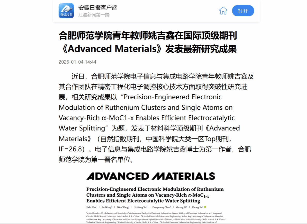 《安徽日报》报道我校教师在国际顶级学术期刊发表论文