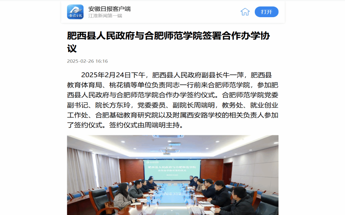 《安徽日报》报道我校与肥西县签署合作办学协议