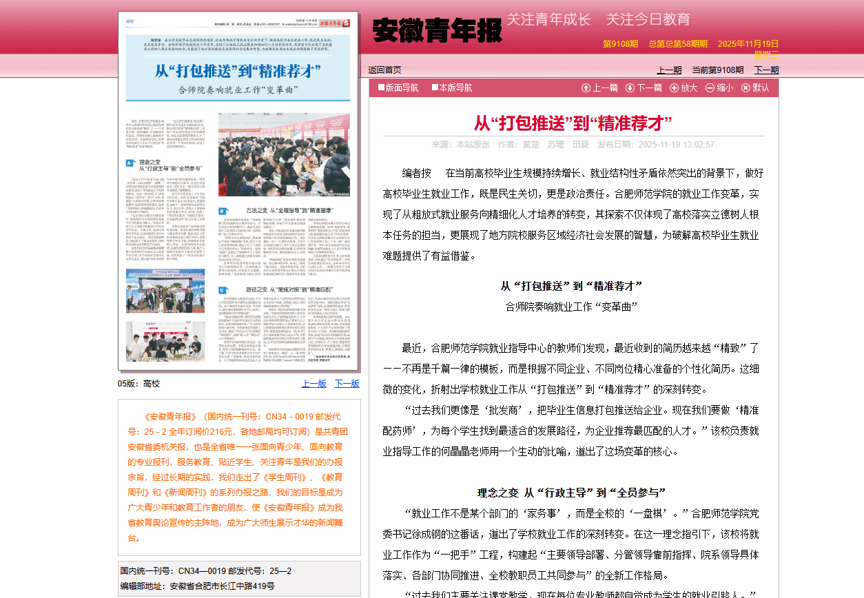 突出就业育人,学校承办的“人才兴皖‘就’在江淮”省级高校毕业生系列招聘活动之“暖心帮扶”专场招聘会,新华社、安徽新闻联播、《安徽日报》等多家中央、省级主流媒体报道“暖心帮扶”专场招聘会。