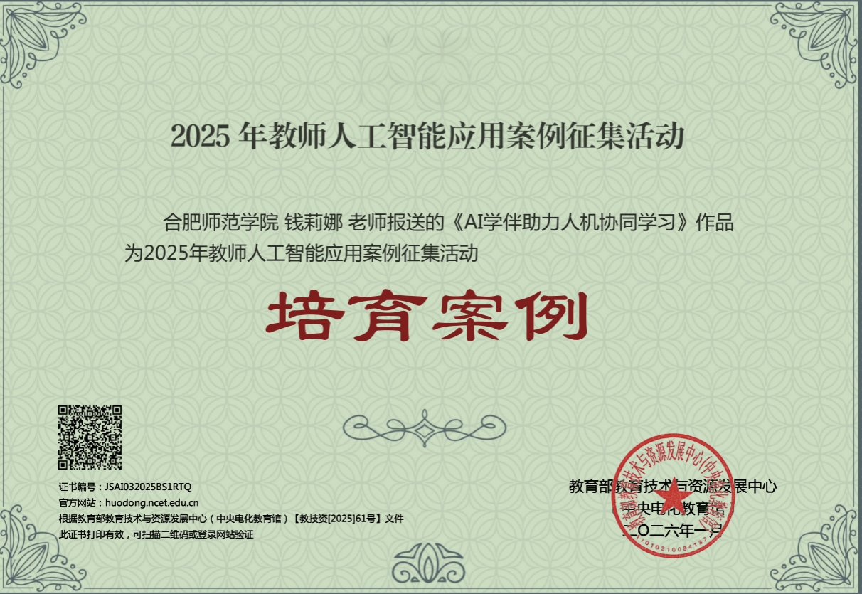 近日,教育部教育技术与资源发展中心(中央电化教育馆)公布《2025年教师人工智能应用案例征集活动结果》(教技资〔2025〕61号),我校外国语学院钱莉娜副教授《AI学伴助力人机协同学习》作品成功入选。