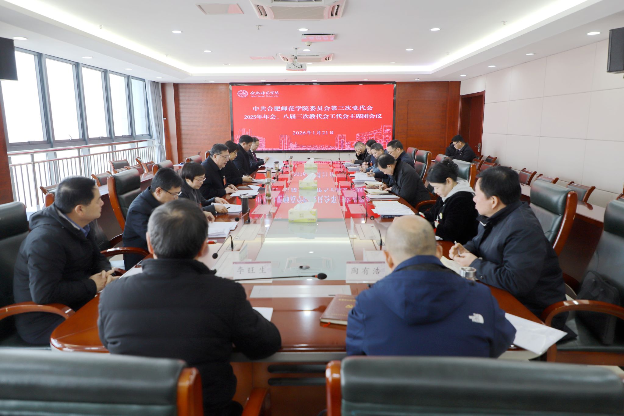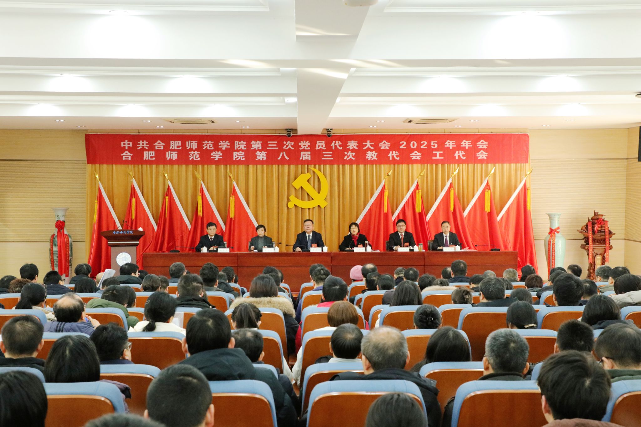 在雄壮的《国际歌》声中,中共合肥师范学院第三次党员代表大会2025年年会和合肥师范学院第八届三次教代会工代会胜利闭幕。