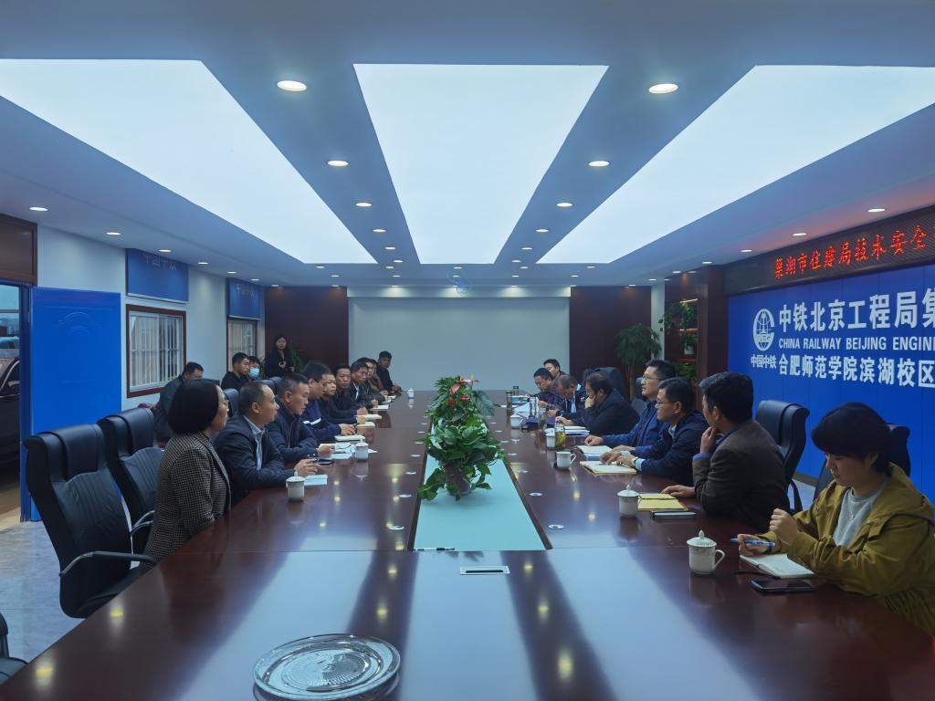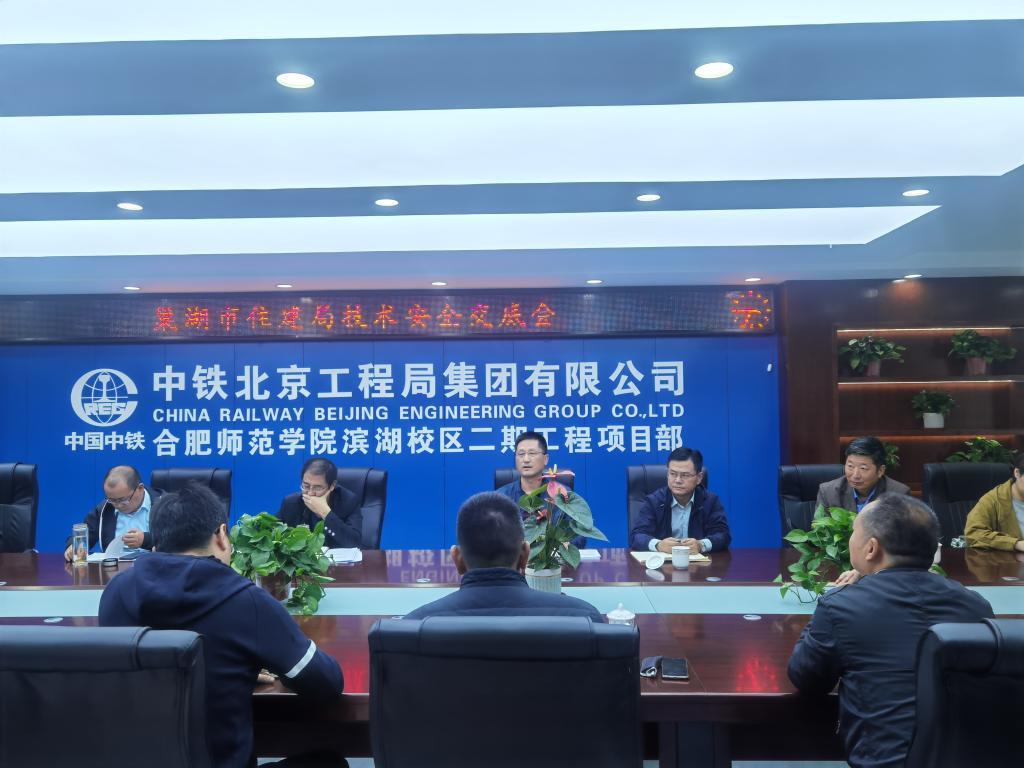 本网讯 10月15日,巢湖市住建局质量监督站丁浩站长一行来校检查指导滨湖校区二期工程建设,并进行技术安全交底,滨湖校区综合管理办公室、基建办主要负责人、广州市广州工程建设监理有限公司、中铁北京局合肥师范学院二期工程项目部主要负责人等参加会议。