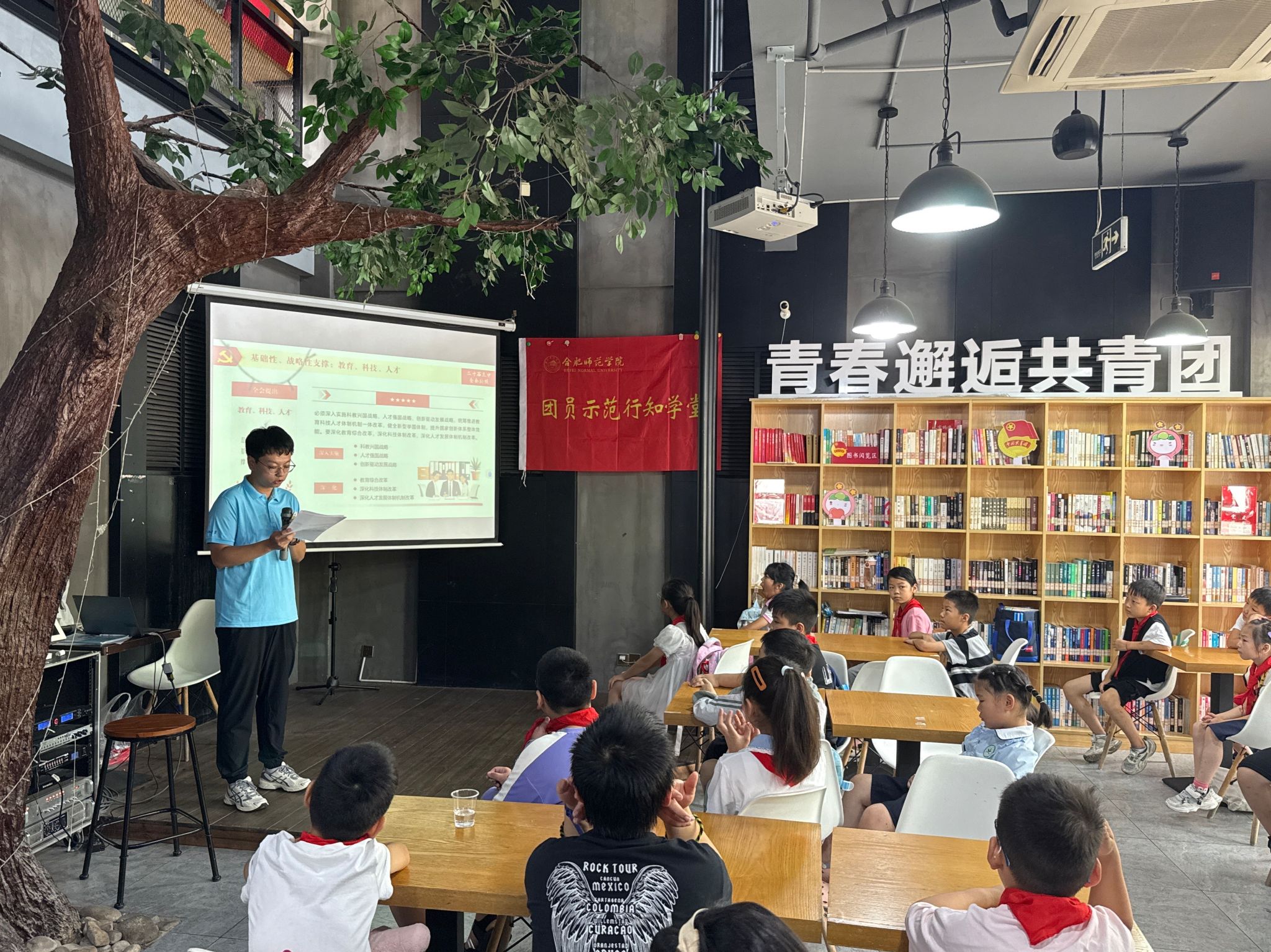 学堂上正播放着电视剧《觉醒年代》的片段,小学员们眼底划过一张张坚毅的脸庞,深刻领悟那个时代中热血青年的觉醒与奋斗。“小先生”徐欣雨与他们携手,共同拉开那段承载着独特记忆的红色帷幕。左权,参与指挥了多次重要战役,为掩护总部机关和群众转移,他身先士卒,不幸被炮弹击中,壮烈牺牲;赵一曼,在战斗中不幸被俘,面对敌人的严刑拷打,仍坚贞不屈,从未泄露任何党的机密;狼牙山五壮士,为掩护主力部队和群众转移,将敌人引向绝路,用生命谱写出一首抗日赞歌,这一路充满了血与泪,但先辈们仍然一路坚定向前,不曾放弃。小学员们认真聆听着老师的讲述,从不同角度感受着先辈们浴血奋战的身影,感受着烙印在我们每个中华儿女身上的精神标记。除此之外,还有无数革命先烈在抗战中英勇抗敌的英雄事迹,等待着小学员们活动结束后一一探索。在此次爱国教育活动结束之际,作为团员青年的“小先生”和少先队员的“小学员”们共勉:“我们学习历史、学习先辈事迹的脚步不会停下,作为生活在新时代的我们,更要传承抗战精神,弘扬爱国主义,并将其落实在生活中。”