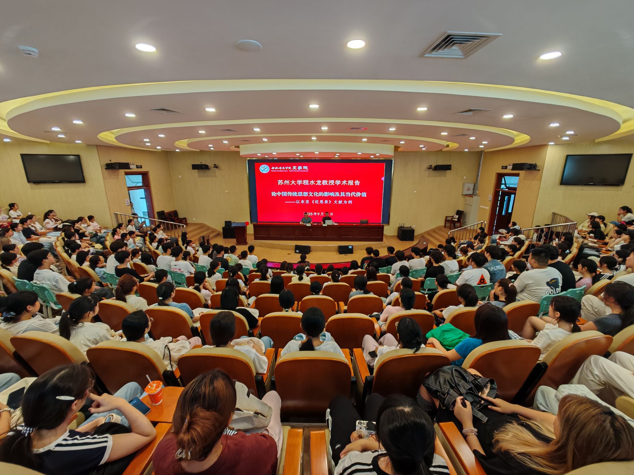 9月12日,文学院新学期“经典阅读”讲坛在滨湖校区学术报告厅开讲,文学院1998届汉语言文学专业校友、苏州大学程水龙教授,以“论中国传统思想文化的影响及其当代价值——以东亚《近思录》文献为例”为题作学术报告,以一部跨越千年的朱子学经典为切口,为现场300余名师生展开了一场关于中华文明连续性与文化自信的深刻对话,拉开文学院70周年校庆系列学术活动的序幕。报告会由文学院院长何旺生教授主持。