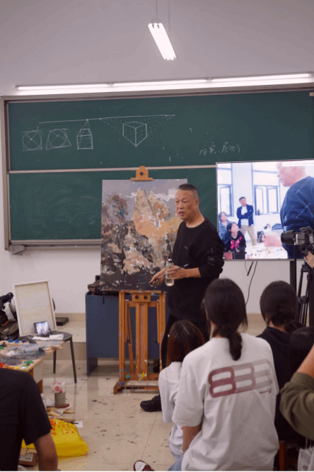 在互动环节,同学们就风景的意境营造、色彩归纳、照片与创作的关系等问题积极提问,李教授均结合自身深厚的创作经验给予了细致解答。他鼓励同学们要“澄怀观道”,在画室的潜心修炼中,培养出一双能发现美、提炼美的眼睛。 此次画室油画示范,成功地将高远的艺术哲思落地为可见、可学的创作方法,不仅深化了同学们对油画本体语言的理解,更展现了学院注重“内外兼修”的教学理念,为学生的艺术成长注入了深刻的启迪。(美术与设计学院:孙哲/文,郝志明、高飞/图)