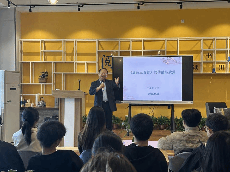 11月5日,锦绣校区“阅+历”读书讲堂“人文十讲”第四讲由北京大学访问学者、中国词学研究会理事、我校文学院副院长甘松教授以“《唐诗三百首》的传播与欣赏”为主题,开展了一场兼具深度与温度的文化讲座。本次讲座由校阅读推广人、文学院教师齐晓坤主持。