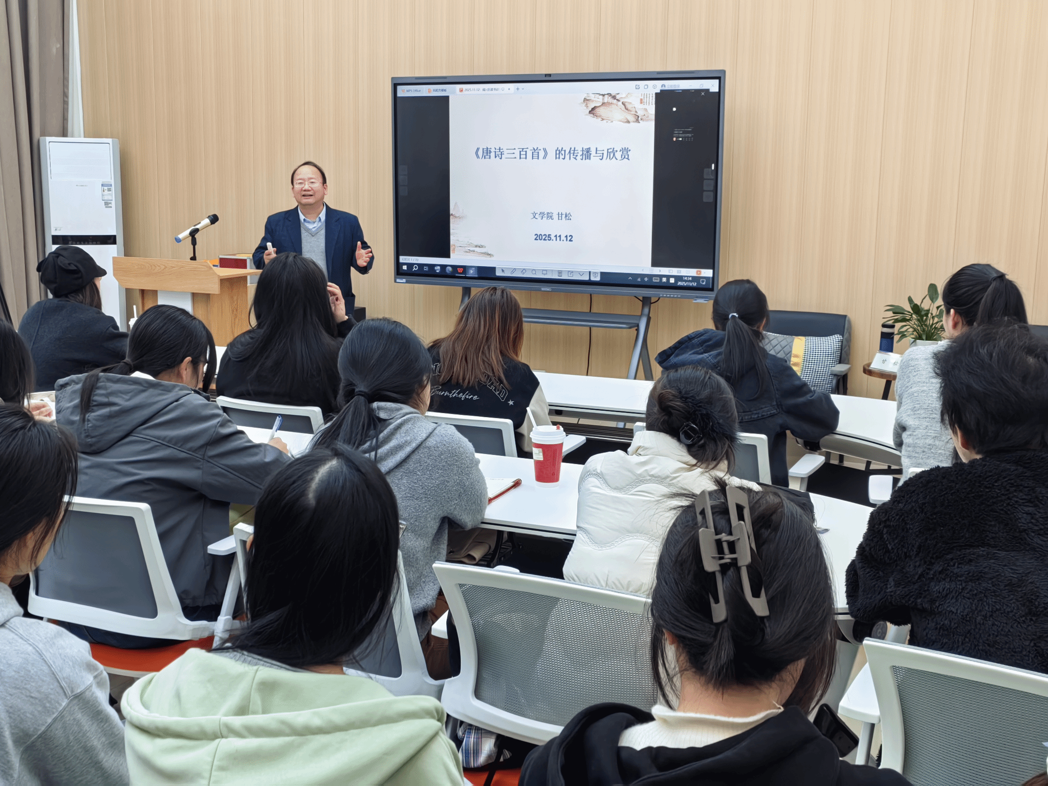 讲座中甘松教授以亲切互动的形式开启主题,围绕三个核心问题层层展开:为什么《唐诗三百首》能成为经久不衰的经典选本?其在古代与现代的传播方式有何异同?当代读者如何科学欣赏这部作品?甘教授指出,《唐诗三百首》自清代蘅塘退士编选以来,因其“精选精编、雅俗共赏”的特质,成为启蒙教育的基石,而现代数字化传播则赋予其新的生命力。