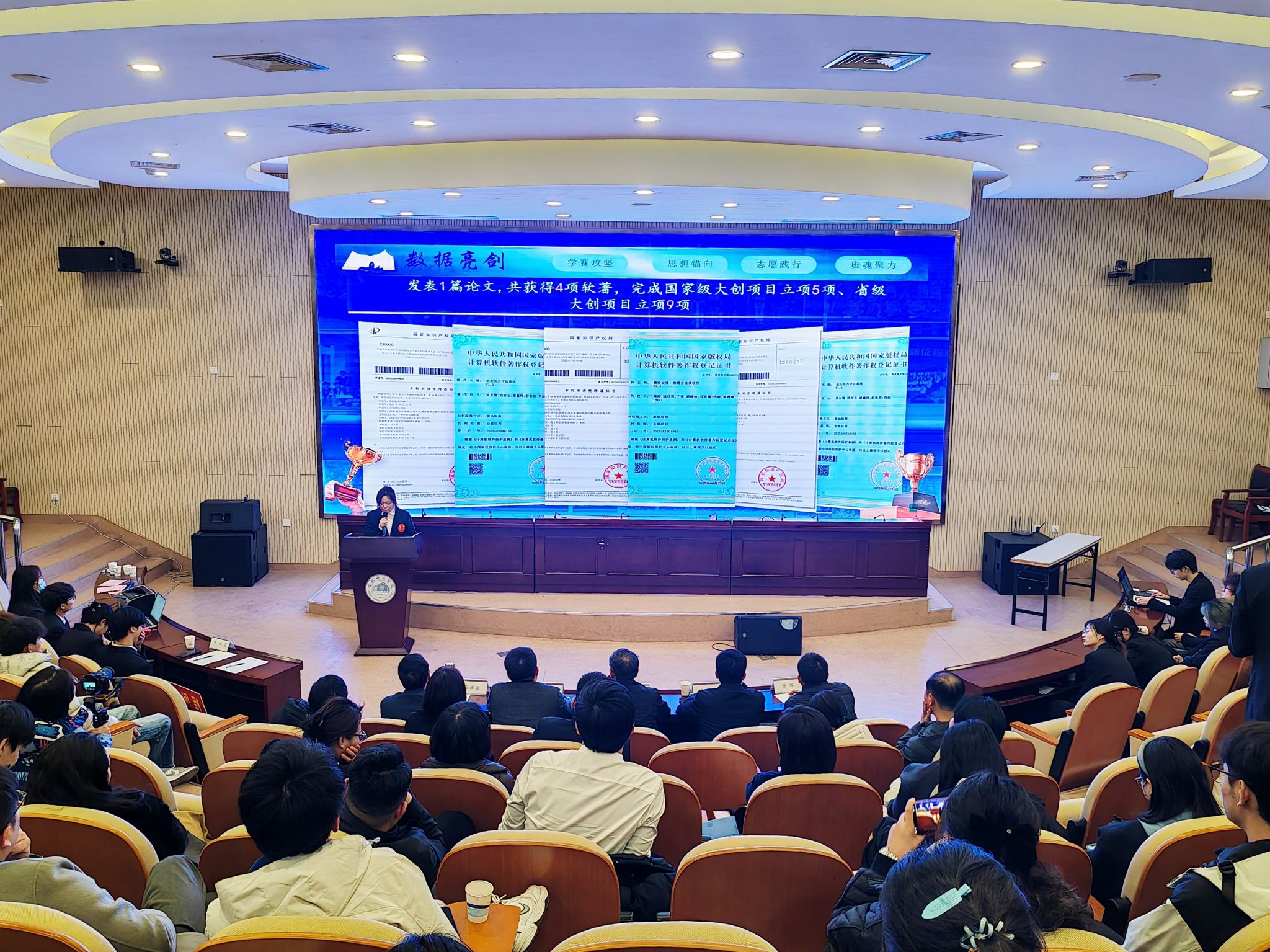 参与汇报的14个班级,经过班级申报、学院推荐、校级初评等多轮筛选,从全校260余个班集体中崭露头角,成为学风建设的优秀代表。汇报现场,各班级代表通过PPT演示、视频展播、音频分享及现场情景展示等多元形式,全面复盘一学年的班级学风建设成果。汇报内容兼具广度与深度,既介绍了晨读互助、课堂建设等学风培育核心举措,也突出了党团思想引领、社区志愿服务、特色集体活动等实践亮点,全面展示了各班级在学业成绩、学科竞赛获奖、科研项目突破等方面取得的荣誉实绩。精彩生动的汇报与强烈的集体荣誉感,让在场师生深刻感受到班集体团结向上、奋进担当的精神力量,现场气氛高涨,场面热烈,充分展现了同学们积极进取的精神风貌和学校良好的育人氛围。