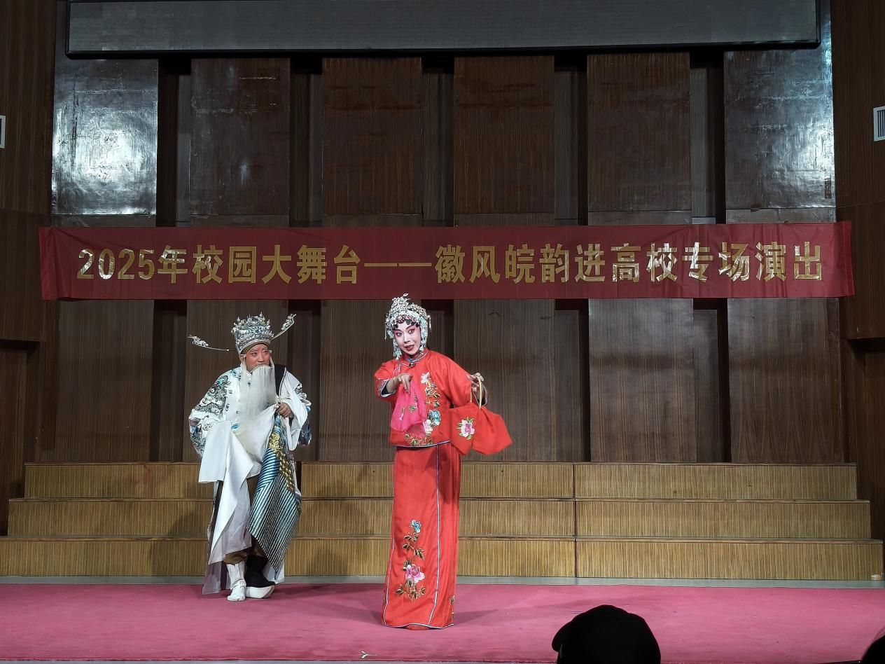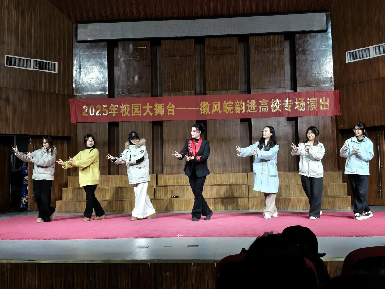 近日,由中共安徽省委宣传部、安徽省教育厅、安徽省文化和旅游厅主办,阜阳市演艺有限公司承办的2025年“校园大舞台——徽风皖韵进高校”专场演出在我校锦绣校区音乐厅举办,师生在艺术思政课中共同领略徽风皖韵,传承弘扬中华优秀传统文化。校团委副书记何磊、兼职副书记唐银及300余名学生观看演出。