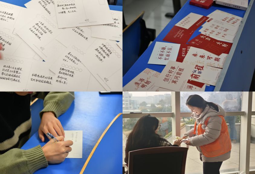 本次活动设置了“祝福驿站”,校学生会准备了空白贺卡、定制钥匙扣、暖手袋以及励志书签等实用且富有纪念意义的物品。钥匙扣上刻有“一研为定”“前程似锦”等鼓励话语,暖手袋则寓意“温暖相伴,握紧梦想”。参加活动的同学们自发在贺卡上写上“考研加油,终将上岸”“星光不问赶路人,时光不负有心人”等祝福语。随后,同学们身着“合肥师范学院学生会志愿者”马甲,化身送温暖小分队,分批前往逸夫楼、图书馆等学习场所,轻声走入自习区,将满载祝福的贺卡、寓意美好的钥匙扣、温暖实用的暖手袋等礼物,送至考研同学手中,在寒冷冬日为学子们送上实实在在的温暖。生物与食品工程学院2022级食品质量与安全专业陈梦琳同学表示,这份突如其来的温暖让她在紧张的复习中感受到来自校学生会的陪伴与力量。