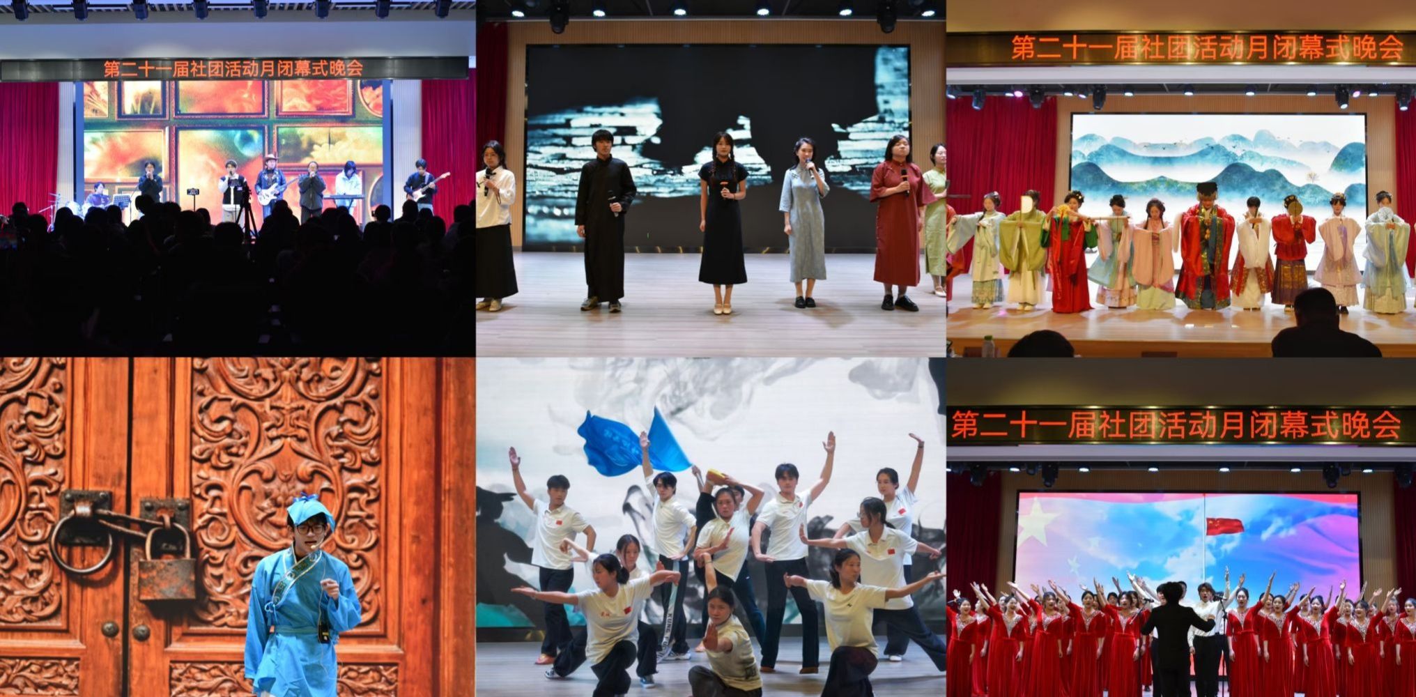 弦舞吉他社以一曲充满青春张力的乐队表演《鲜花》点燃全场氛围;大学生艺术团带来古典舞《苏幕遮》,将古典诗词中的朦胧意境化为灵动舞姿;青轻行走朗诵社的成员们则以《百年沧桑》为主题,让观众在文字与声音的碰撞中感受到青年的责任与担当;止戈武术协会的《武韵风华》尽显中华传统武术的独特魅力;艺韵音乐社、营销策划协会等四个社团联合带来的合唱《爱你》,以活泼的曲风与默契的配合,传递出青春的热烈与鲜活;第二十三届、二十四届校园十佳歌手冠军王成燚、付雨涵共同演绎的《千千阙歌》,用细腻的声线将经典旋律赋予新的青春质感;体育舞蹈协会的《金色空间》以动感的舞步展现肢体韵律;文记赏馨曲艺社的黄梅戏选段《夫妻观灯》则以地道的唱腔与生动的表演,让传统戏曲文化在校园舞台焕发生机;景行话剧社带来的原创短剧《谁是拖延鬼》,以贴近校园生活的剧情与幽默的表演,引发了现场学子的共鸣;主持人协会的朗诵《天路》以深情的语调描绘时代发展的壮阔图景;踏歌汉文化协会的《霓裳羽衣,镜采华章》汉服走秀,展现了中华传统文化的审美意蕴;最后,大学生艺术团合唱团以《明天你好》《再一次出发》两首歌曲收尾,晚会在全场观众的掌声中落下帷幕。