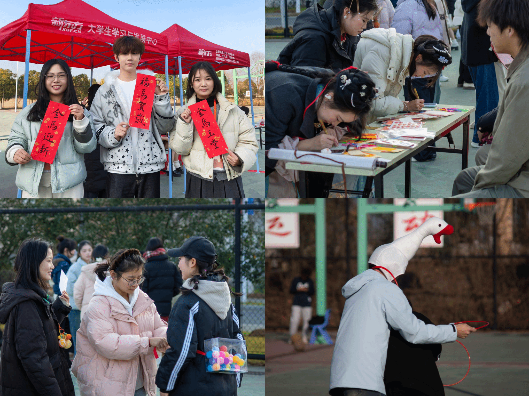 早在晚会开始前,直播的触角已延伸至午后热闹的新春活动集市。28日下午,文学院设置的新春活动集市六大互动区域同步解锁年味狂欢,直播组穿梭其间,多机位记录精彩瞬间,让线上观众亦能“云”逛集市,感受浓浓年味。“迎春纳福·笔底舞龙蛇”专区内,书法特长学子挥毫泼墨,笔走龙蛇间,红底黑字的楹联与精巧别致的书桌小春联新鲜出炉,墨香氤氲中传递着最真挚的新春祝福;“岁启诗签·墨韵迎新春”里,同学们伏案提笔,将对新年的憧憬与期许诉诸笔墨,一张张书签、一枚枚明信片,都成为承载心愿的珍贵信物。成语接龙换套圈的脑力比拼、萌趣套大鹅的团队协作、诗韵转盘的诗词挑战、摇摆闯关的体能较量、憋笑大挑战的趣味互动,让现场欢声笑语不断。这些生动场景通过直播画面实时分享,吸引了众多线上观众互动留言。师生们在沉浸式体验中感受传统文化与趣味游戏的碰撞,收获满满的欢乐与惊喜。