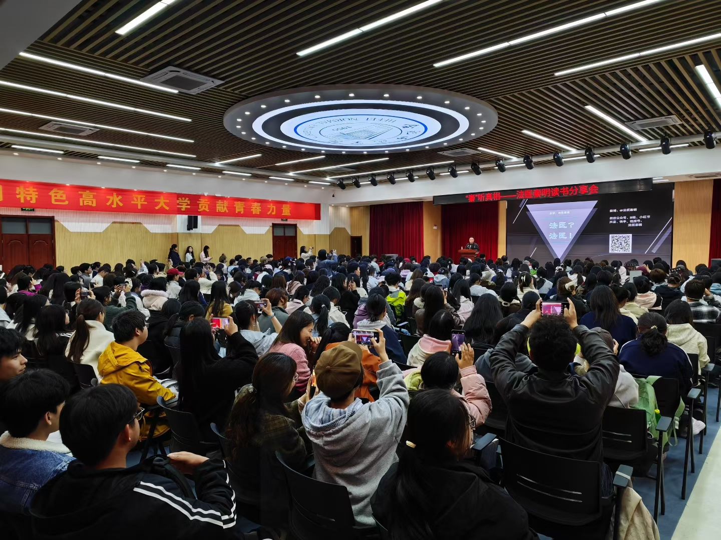 分享会上,秦明结合自身多年一线法医工作经历,以真实案件为切入点,用生动鲜活、幽默易懂的语言,详细拆解了法医日常工作流程,深入解读了案件侦办中科学逻辑的运用细节,一步步揭开了法医职业的神秘面纱。他通过具体案例,让在场师生直观感受到法医“为生者权、为死者言”的沉甸甸职业使命,体会到法医工作中严谨细致的科学精神与温暖共情的人文关怀,为师生们呈现了一场兼具专业性、趣味性与思想性的视听盛宴。