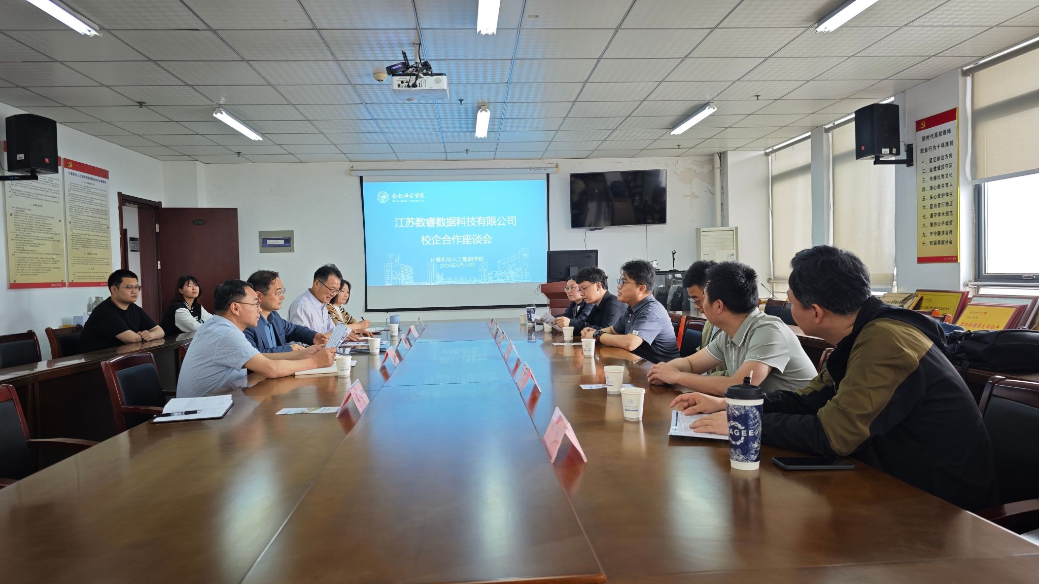 为进一步深化产教融合、校企合作,精准对接企业人才需求,全力拓宽毕业生就业渠道,助力2026届毕业生实现高质量就业,4月27日上午,计算机与人工智能学院在行知楼1302会议室成功举办江苏数睿数据科技有限公司校企合作座谈会。校党委委员、副院长李学俊,计算机与人工智能学院党委书记王祥、院长谢飞、党委副书记杨萍、毕业班辅导员,以及江苏数睿数据科技有限公司人力资源总监李争辉、项目产品部部长杨嘉阳等一行6人参加座谈。