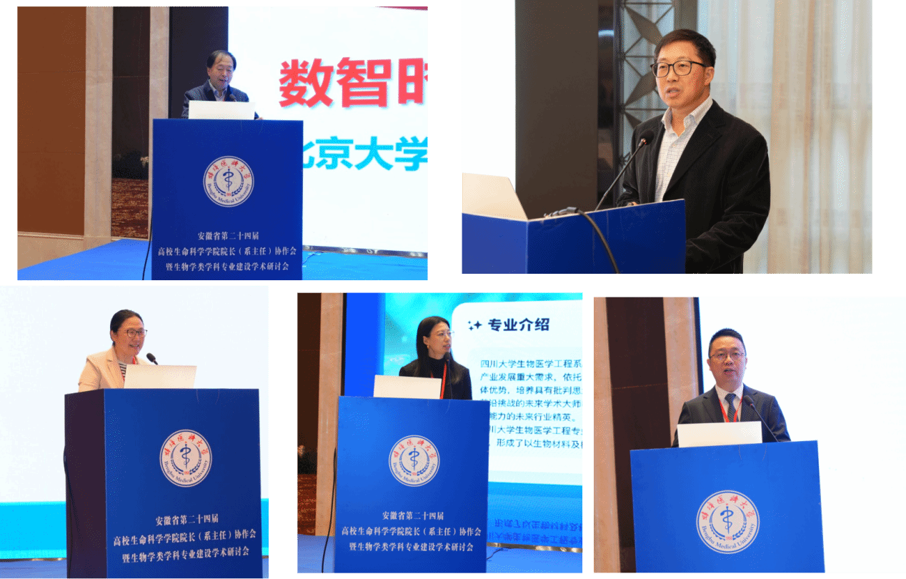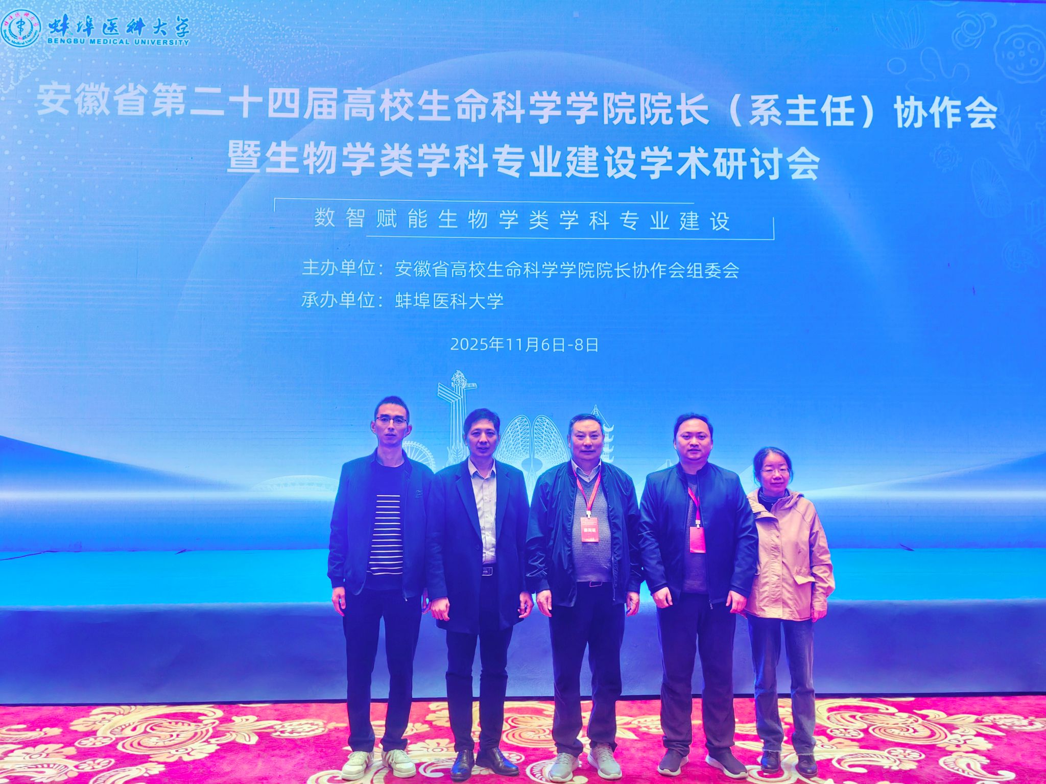 2025年11月6日-7日,合肥师范学院原党委副书记、副校长、安徽省大学生生物标本制作大赛专家委员会主任李进华教授、生物与食品工程学院副院长陈金武、实验室主任耿明、朱勇教授和张启信博士一行5人参加由安徽省高校生命科学学院院长协作会组委会主办、蚌埠医科大学承办的“安徽省第二十四届高校生命科学学院院长协作会暨生物学类学科专业建设学术研讨会”。大会以“数智赋能生物学类学科专业建设”为主题,来自全省21所本科高校的100余位院长、系主任、专家学者及教师代表参会。