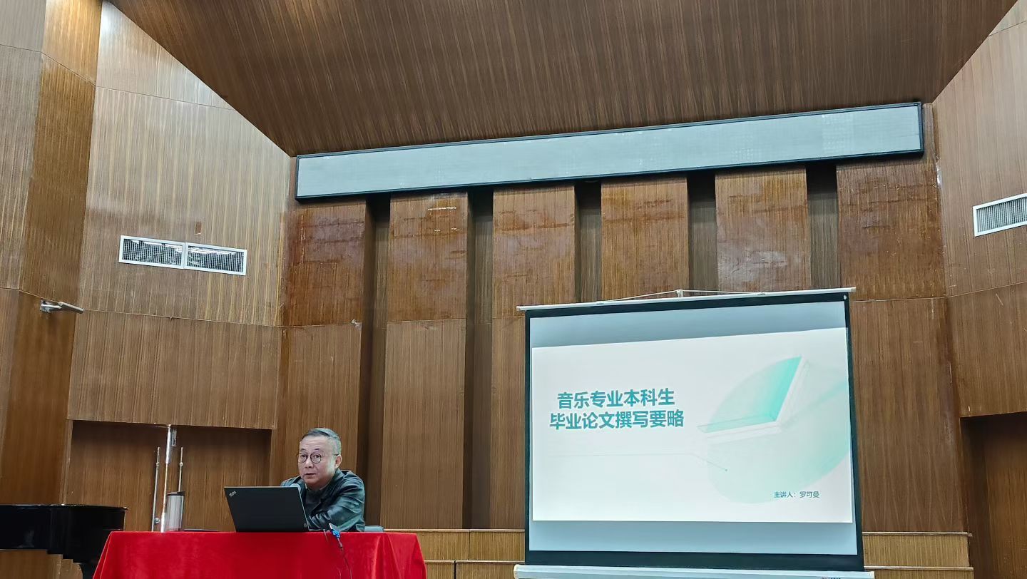 讲座中,罗可曼围绕五大核心板块展开阐述。他首先明确学士学位论文的核心要求,强调论文需兼具学术性、独立性与规范性三大特征,指出毕业论文写作本质上是一次系统的科研训练,是培养本科学生学术思维的关键环节。针对音乐专业的学科特性,罗可曼分别聚焦音乐教育、音乐学、音乐表演三类学术论文的撰写要点。他结合自身研究经历,以两篇学术论文及“学习习近平总书记重要讲话精神的心得体会”的撰写过程为例,生动阐释了不同类型论文的写作样式与切入角度。尤为重要的是,他提出“是什么?为什么?证明什么?”的三维写作思路,为学生搭建起清晰的论证框架。在论文表达与学习态度层面,罗可曼着重强调文字表达的精准性与逻辑性,提醒学生注重学术语言的锤炼。他结合大学教育的本质,寄语学生“大学是自学的学习”,鼓励大家在论文写作中主动探索、自主研究,培养独立思考能力。此外,他还针对论文选题、文献梳理、格式规范等常见问题进行细致讲解,为学生规避写作误区提供实用指引。