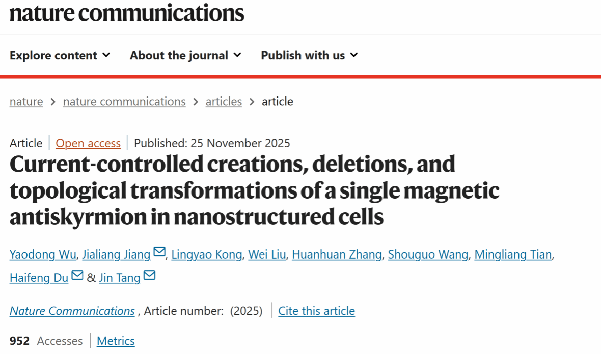 根据涡旋性,拓扑磁结构可分为斯格明子与反斯格明子。然而,当前对单个反斯格明子的电控操作一直未能实现,制约了其在实际器件中的应用。研究团队设计并制备了尺寸约为400纳米的FeNiPdP纳米结构,在该结构中成功稳定了单个反斯格明子。通过施加纳秒级电流脉冲,仅通过调节电流密度,即可实现反斯格明子的可逆创建与删除,并实现其与斯格明子、磁泡和铁磁态之间的可控拓扑转换。更为重要的是,这些电控操作在室温下依然稳定可靠,且具有高度的可重复性,为未来基于磁反斯格明子的器件集成奠定了基础。研究还通过微磁模拟揭示了其物理机制:自旋转移力矩和焦耳热效应共同作用,驱动了这些拓扑态的快速转变。该研究首次实现了对单个反斯格明子的全电控操作,展示了其在多态信息处理、拓扑存储器和可重构逻辑器件中的巨大潜力,为推动反斯格明子从基础研究走向实际应用迈出了关键一步。近期相关成果以“Current-controlled creations, deletions, and topological transformations of a single magnetic antiskyrmion in nanostructured cells (DOI: 10.1038/s41467-025-66814-5)”为题发表在《Nature Communications》期刊(中国科学院大类一区Top期刊,IF = 15.7)。