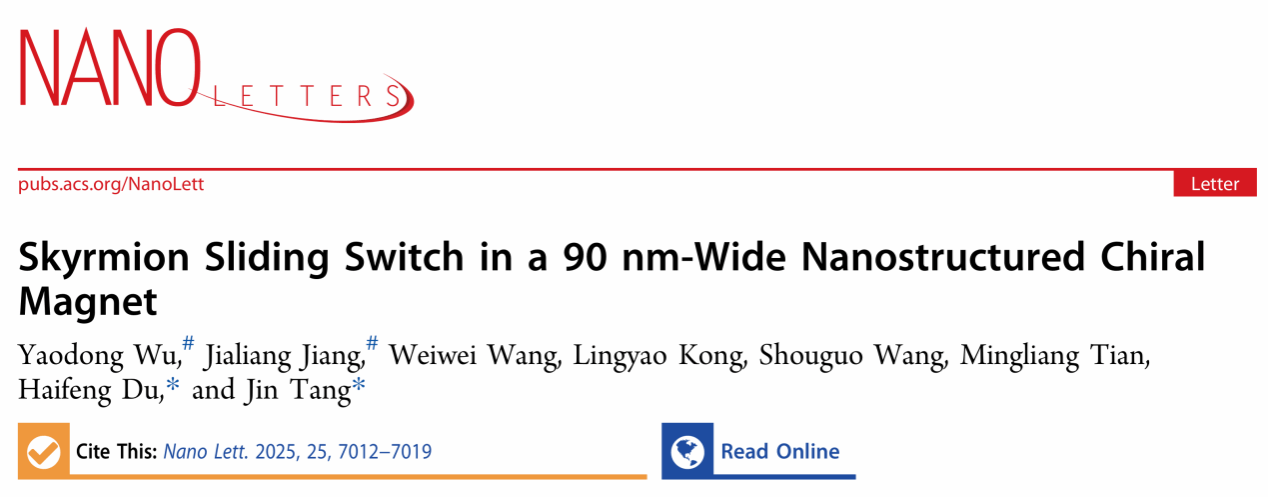 研究团队还提出并验证了斯格明子滑动开关存储原理性器件。研究团队制备了超窄90纳米宽FeGe受限桥结构,斯格明子与边界间的吸引相互作用在限域系统中诱导了自发的双能量势垒,斯格明子在双势垒间的来回运动可代表存储单元“1”和“0”。进一步,研究团队通过施加超短纳秒脉冲电流,实现了可控驱动斯格明子的左右往复运动,验证了滑动开关存储功能。基于斯格明子位移的随机存储方式避免了写入/删除操作中的拓扑转变,且可以利用自旋极化电流驱动斯格明子运动,而斯格明子的高速运动也能实现高速度存储,是更具通用性的高性能斯格明子随机存储方案。近期相关成果以“Skyrmion Sliding Switch in a 90 nm-Wide Nanostructured Chiral Magnet (DOI: 10.1021/acs.nanolett.5c00781)”为题发表在《Nano Letters》期刊(中国科学院小类一区Top期刊,IF = 9.1)。