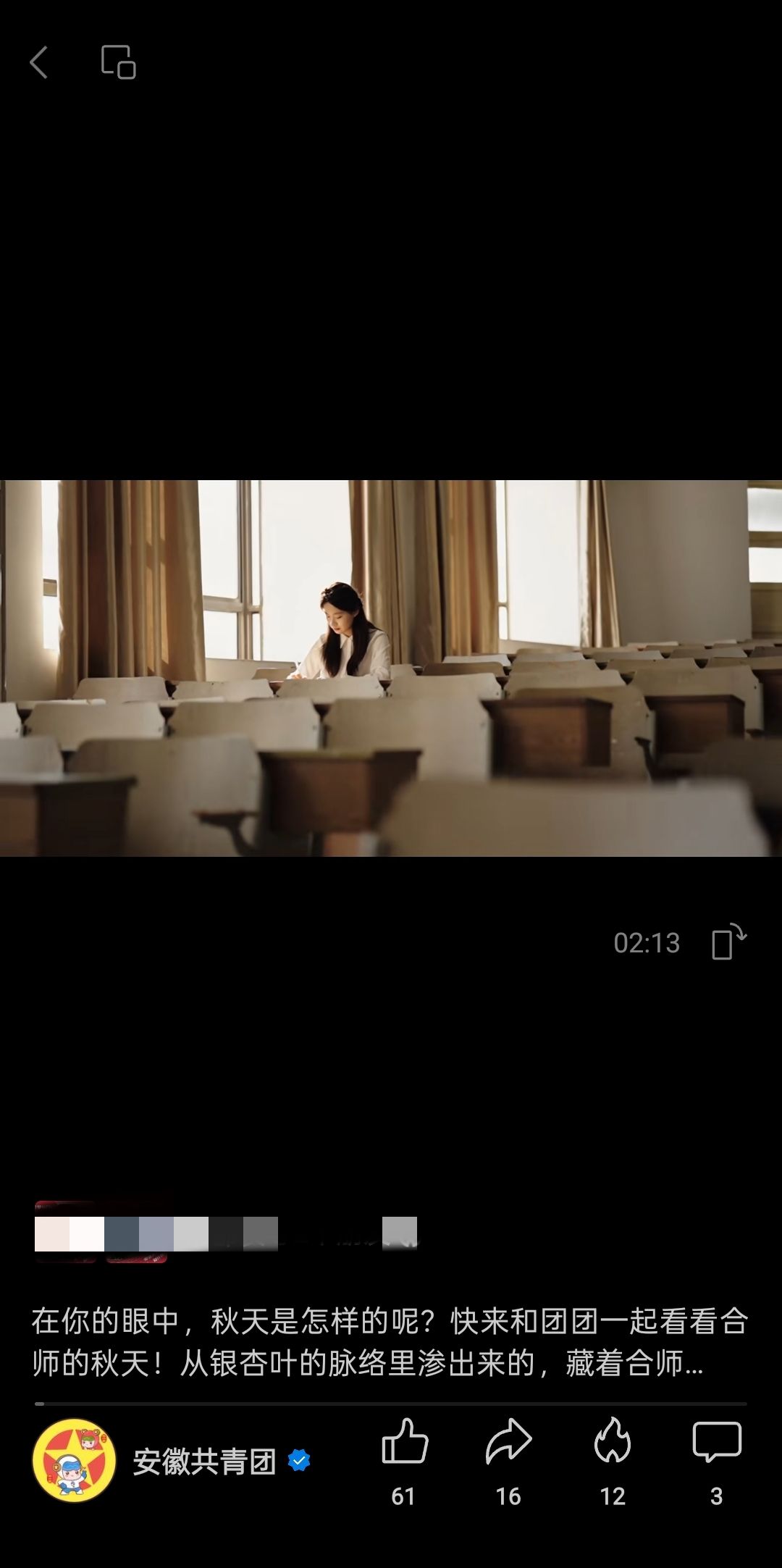 11月14日,安徽共青团视频号发布我院合师视觉名片系列《秋》主题宣传片。(宣传部)